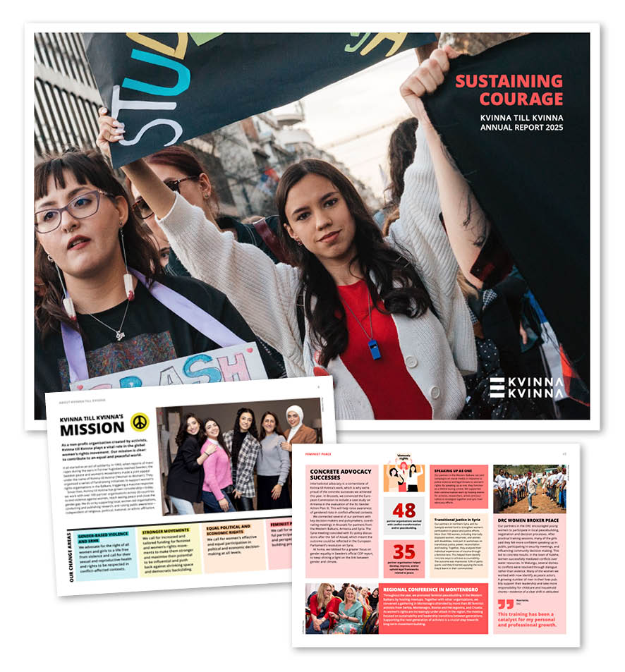 Kvinna till Kvinna är en av världens ledande kvinnorättsorganisationer med verksamhet i 20 krigs- och konfliktdrabbade länder. Vårt uppdrag är tydligt: att bidra till en jämställd, fredlig och rättvis värld där kvinnor har makt över sina liv.